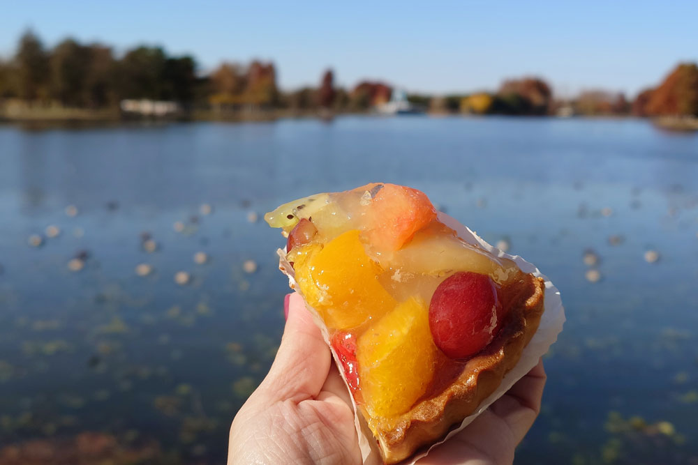 水元公園の水辺で友達が買ってきてくれたフルーツパイ♪