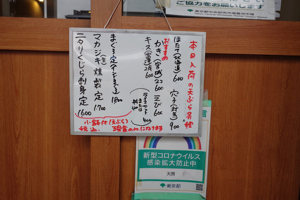 真冬の装備で外に出ましたが、もう一枚着込んだほうがよかったかもと、すぐ後悔しました。走ってないと体温が奪われる!と必死で走って豊洲市場に到着です。本日は天房へ行きました。