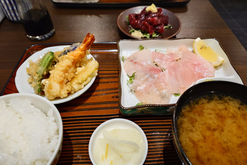 マカジキ燻製定食にくじら刺し身を単品で付けて朝ごはんです。