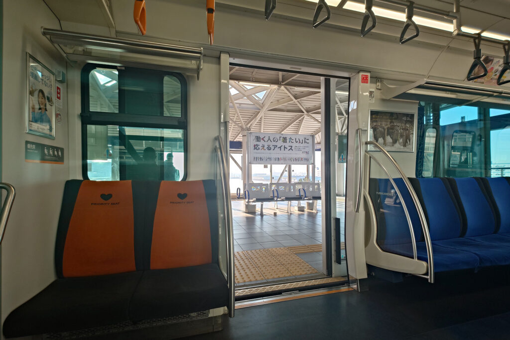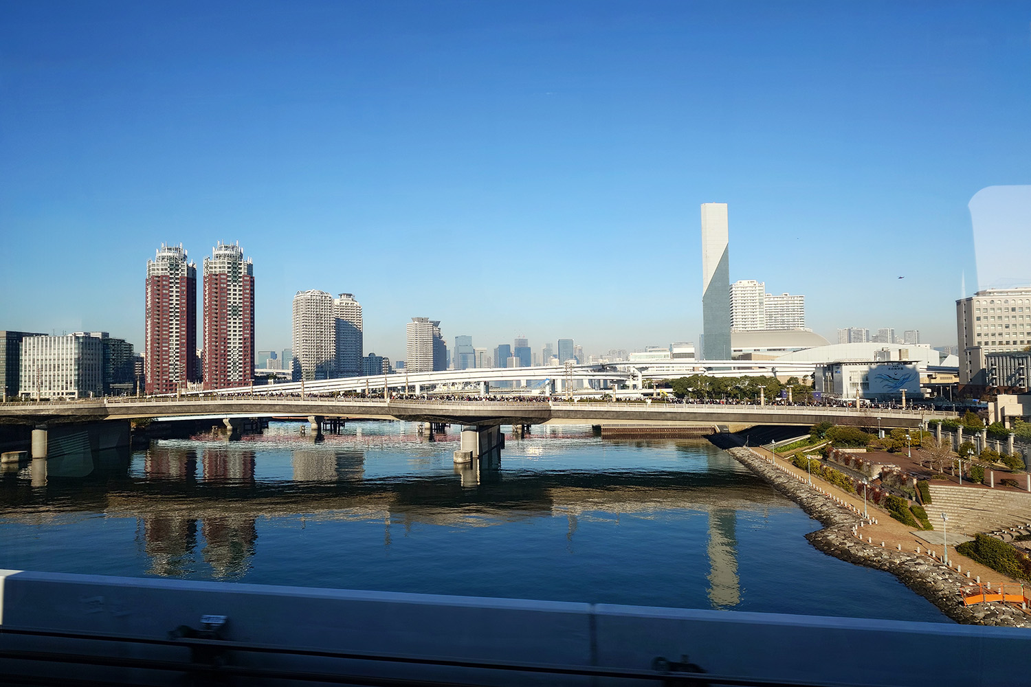最寄り駅に満杯の人を詰めたゆりかもめが入ってきました。満員電車になんとか入れてもらいます。大きなスーツケースを持った人が多く、頭上の空間の割に足元が混雑しています。