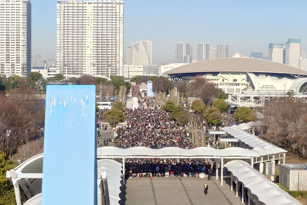帰りのゆりかもめから有明駅前のコミケ待機列を眺めます。夢の大橋にも行列が続いていました。