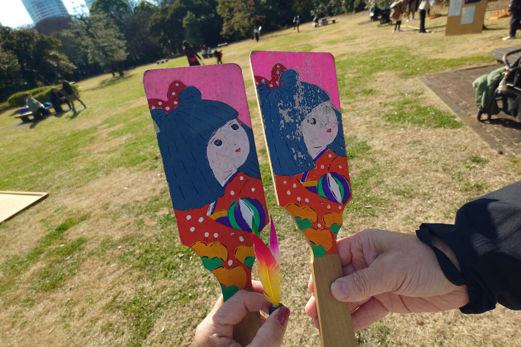 お楽しみ広場で独楽や羽付き等の貸し出しがありました。