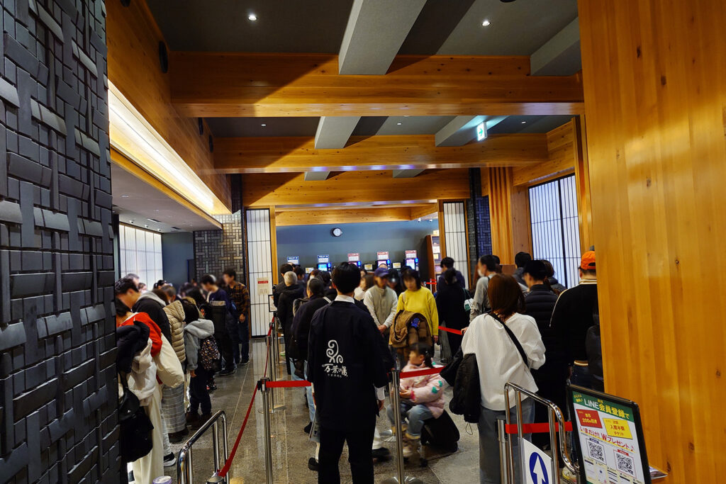 一眠りしてまたお風呂に戻ったら、やったらめったら混んでたので、そろそろ帰ろうと15時半にフロントに戻ったら、ものすごい行列ができてました。エレベーターで2階に降りたら、エレベーター待ちの行列が運河側に長く伸びてました。