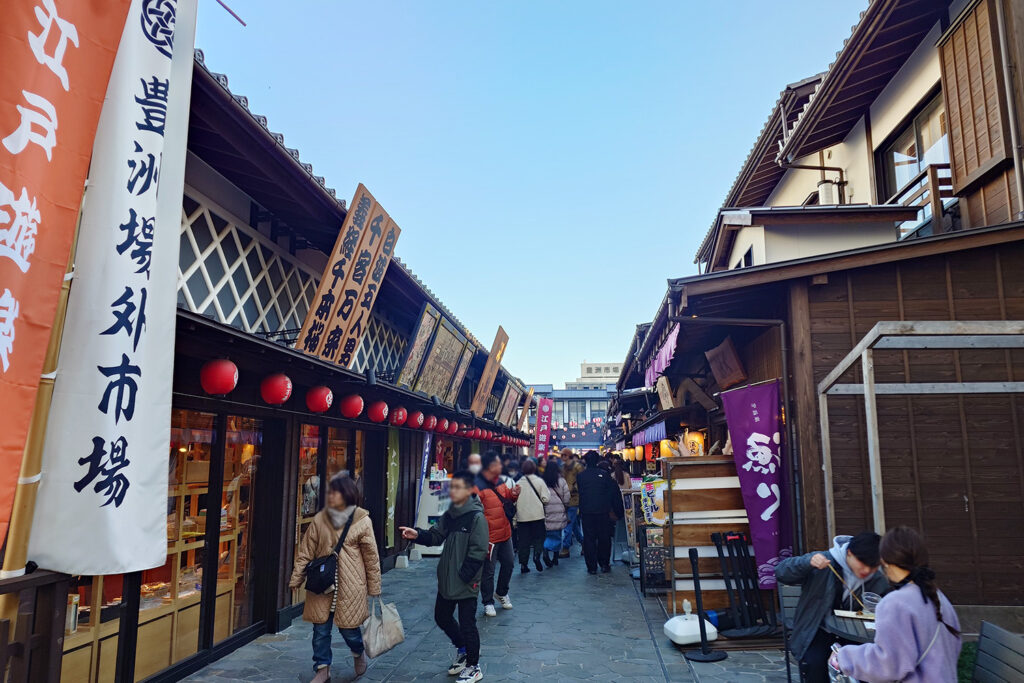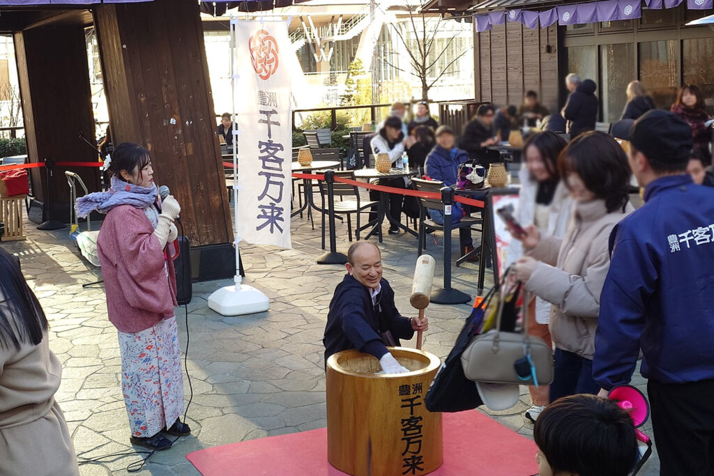 豊洲場外市場も大勢の人で賑わっていました。餅つきのイベントも大盛況です。