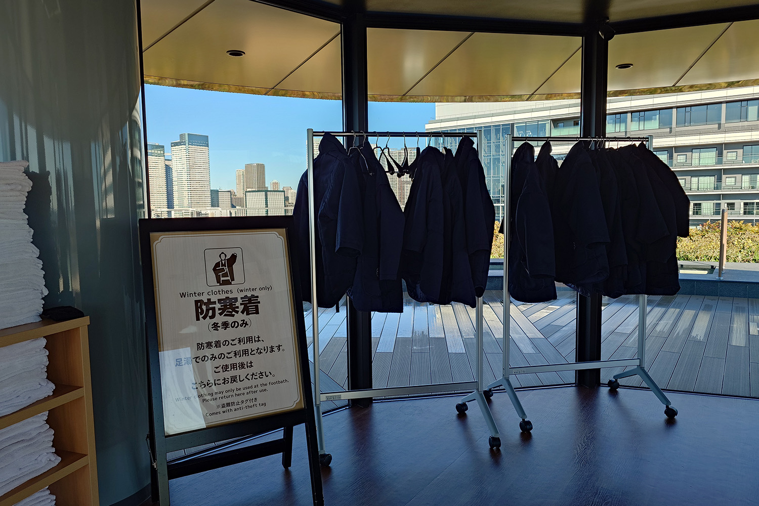 富士山が見えるかもと思って、食後に10階の展望足湯へ行きましたが、ビルの影に入って見えませんでした。防寒着が用意されていましたが、あまりの寒さに足湯には入らず、大浴場に戻りました。