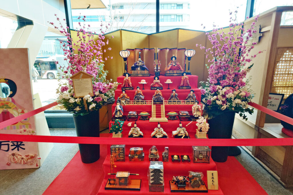 豊洲千客万来にお雛壇が飾られていました。金屏風に桃の花の飾りが添えられて、場に華やぎがあります。