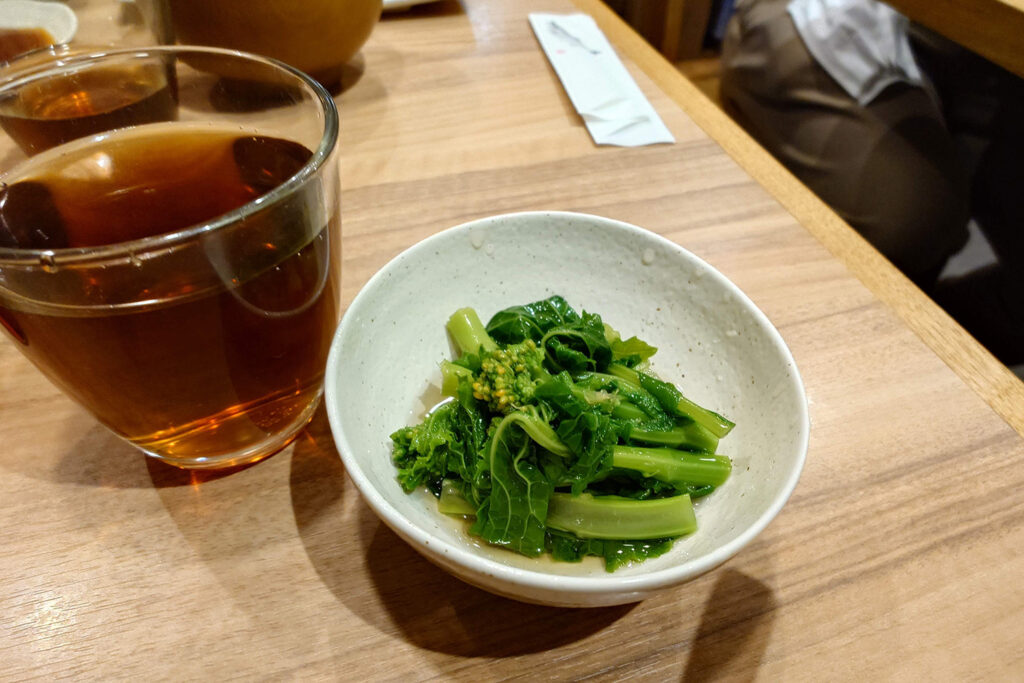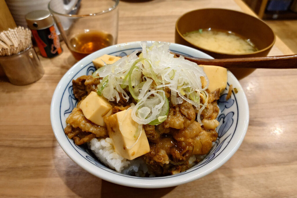 牛煮込み丼でと菜の花の煮浸しを頼みました。ぶりっぶりの牛すじ煮込みでした。