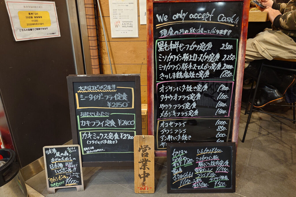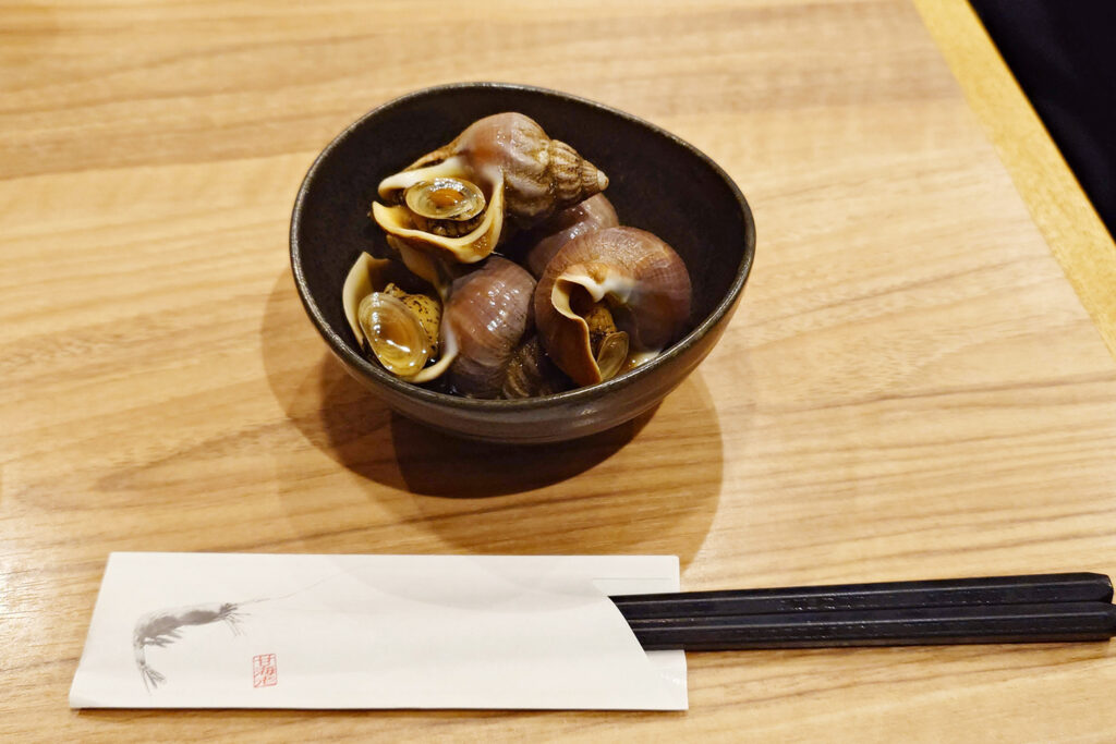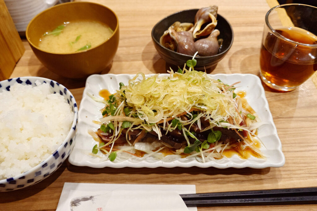 いつもより早めに小田保さんに到着したけど、小看板が出ていいました。ラッキー♪カツヲとミョウガのサラダとイソツブ貝煮を定食でいただきます。
